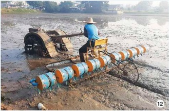 11 -12. นำข้าวใส่เครื่องหยอด ที่คุณอดิเรกประยุกต์ขึ้น เพื่อลดต้นทุนเมล็ดข้าว และไถหยอดในนาข้าว