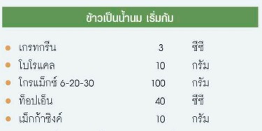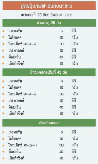 หมายเหตุ : ปุ๋ยทางดิน ข้าวอายุ 45 วัน ใส่สูตร 16-20-0. 16-8-8 ผสมเทอร์โบแม็ก 3-5 กิโลกรัม ต่อปุ๋ย 50 กิโลกรัม