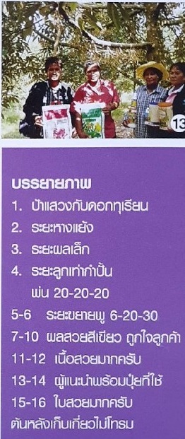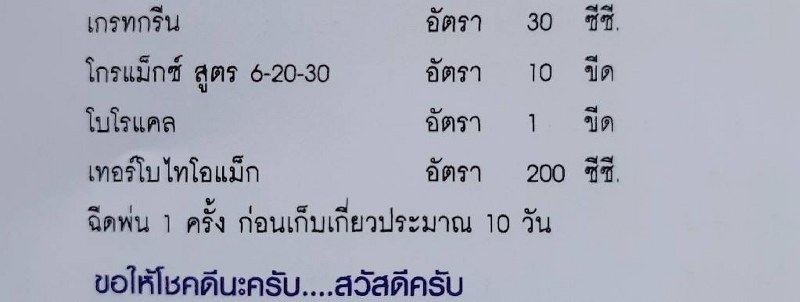 แนะนำนะครับ ให้ใช้ปุ๋ยสูตร 6-20-30 เพื่อเร่งให้ผลแก่เร็ว และเพิ่มเทอร์โบไทโอแม็กเพื่อเพิ่มความเขียวของผล โดยผสมดังนี้นะครับ