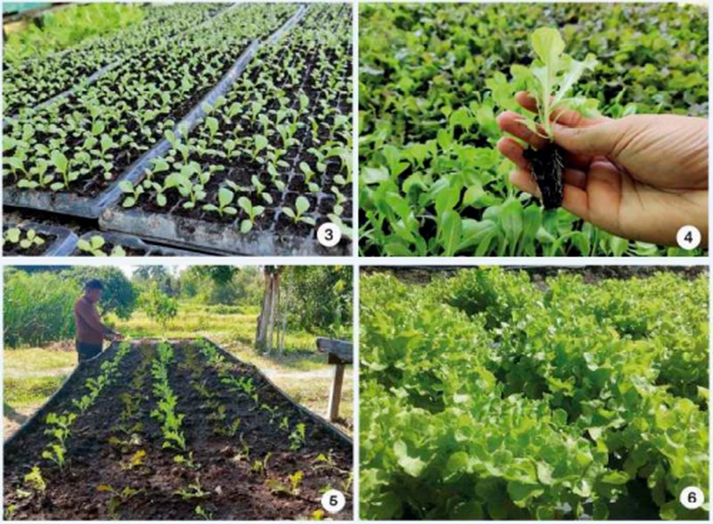 ภาพ:ย้ายกล้าลงแปลงปลูกต้นกล้าที่มีรากเยอะสมบูรณ์. แปลงผักสลัดฟื้นไวหลังย้ายต้นกล้า โดยใช้ เจอร์มิเนท พ่นหลังย้ายกล้า