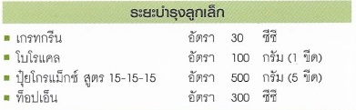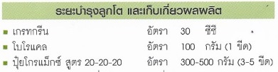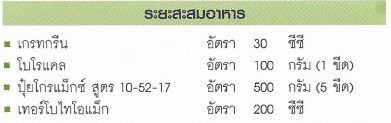 หมายเหตุ : ช่วงเก็บเกี่ยวผลผลิต จะเพิ่มปุ๋ยโกรแม็กซ์สูตร 6-20-30 อัตรา 300 กรัม (3 ขีด) ร่วมกับปุ๋ยโกรแม็กซ์ สูตร 20-20-20 อัตรา 300 กรัม