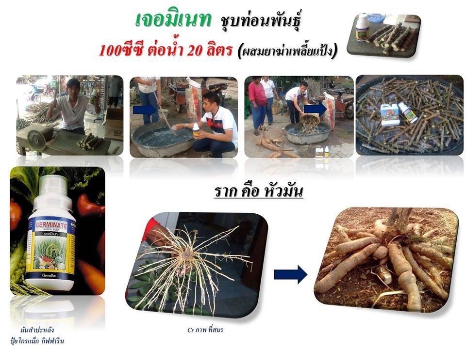 คุณสมศรี : วิธีการใช้เริ่มตั้งแต่ แช่ท่อนพันธุ์ ด้วย เจอร์มิเนท เร่งรากก่อนปลูก หลังจากนั้นพอปลูกได้ประมาณเกือบเดือน เริ่มทำการฉีด พ่นโดยใช้ปุ๋ยและผลิตภัณฑ์เกษตรกิฟฟารีนต่อ น้ำ 20 ลิตร ดังนี้