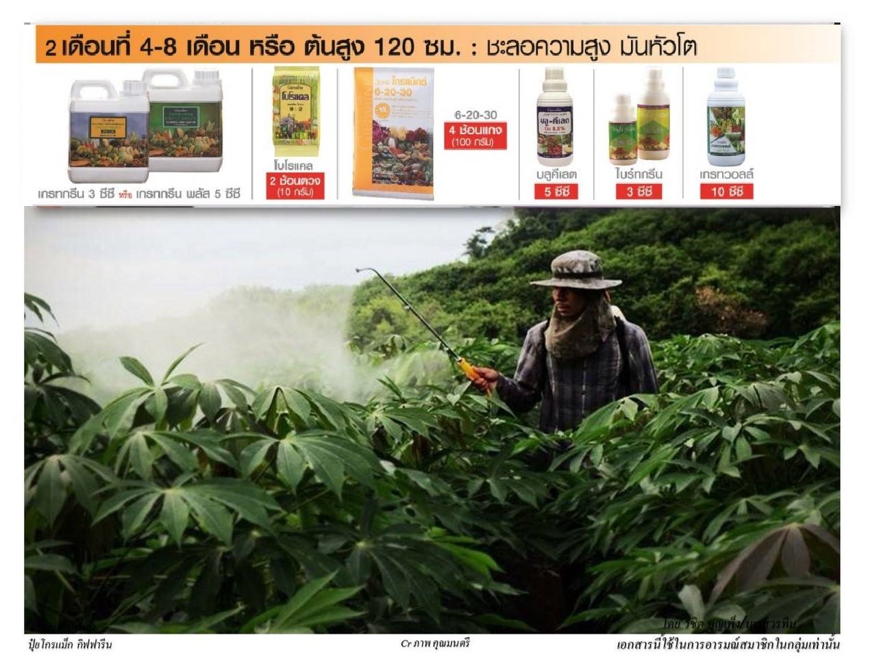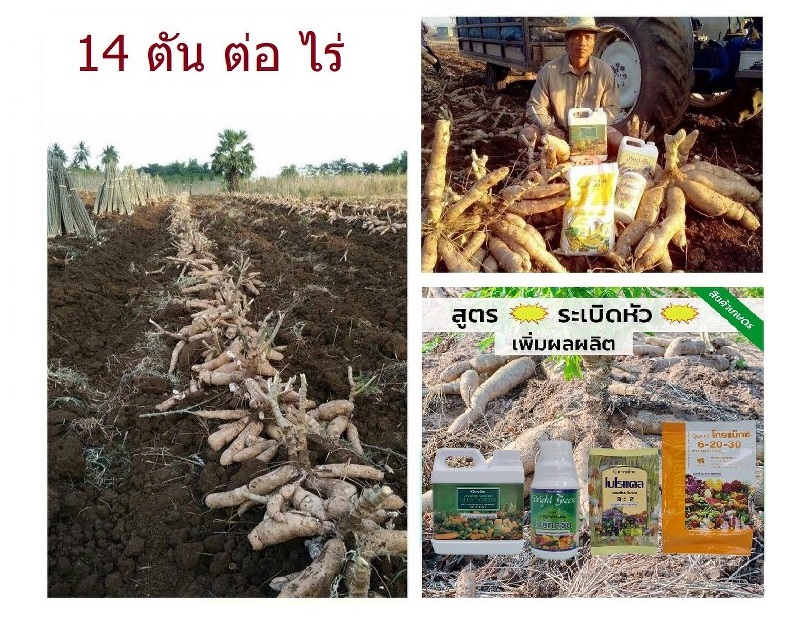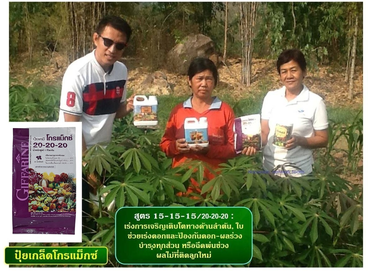 คุณสมศรี : ผลิตภัณฑ์ที่ประทับใจก็มี เจอมิเนท ครับ รากออกดี หัวเยอะ  และก็ ตัว แคลเซียมหรือโบโรแคล ตัวนี้ช่วยให้ระบบรากและต้นแข็งแรงดี และที่สำคัญใบไม่ค่อยร่วงง่าย ซึ่งก่อนหน้าที่ยังไม่ใช้ โบโรแคล ใบร่วงง่าย เหลือแต่ยอดเลยครับ อีกตัวก็ ปุ๋ยโกรแม็กซ์ สูตร 6-20-30 หัวใหญ่น้ำหนักดี ที่สำคัญเปอร์เซ็นต์แป้งเพิ่มขึ้นครับ