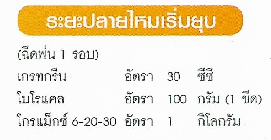 ระยาเวลาพ่นปุ๋ยทางใบ สำหรับข้าวโพด (อัตราส่วนต่อน้ำ 200ลิตร)