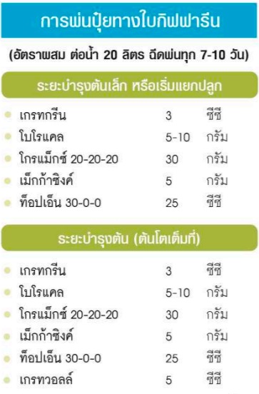 หมายเหตุใช้เกรทวอลล์ อัตรา 5 ซีซี ต่อน้ำ 20 ลิตร พ่นเดือนละ 1-2 ครั้ง ในระยะต้นโตแล้ว (ไม่แนะนำใช้ตอนต้นเล็ก เป็นใบอ่อน)