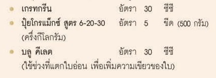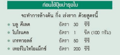 หมายเหตุ ผสมน้ำ 200 ลิตร พ่น 2-3 รอบ ฉีดพ่นกึ่งใบ ลำต้นและลงดินด้วย หลังจากนั้นใช้ เกรทวอลล์และเทอร์โบไทโอเม็กซ์ ผสมยาเชื้อราฉีดพ่นลงดิน เพื่อเร่งราก ทำให้ดินร่วนซุย และกำจัดเชื้อราทางดินครับ