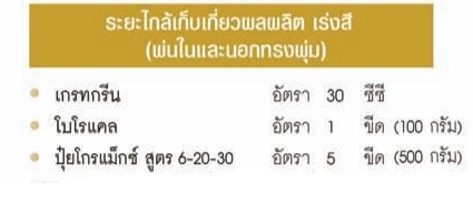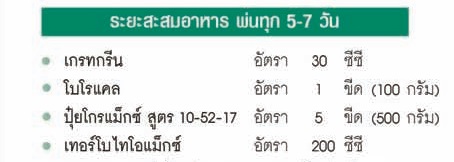 หมายเหตุ : เน้นฉีดพ่นที่ใบและลูก พ่นทุก 7-10 วัน