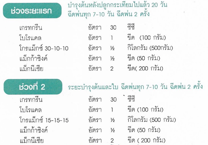 หมายเหตุ : ระยะบำรุงต้นและใบ ฉีดพ่นครั้งที่ 3 เปลี่ยนเป็นปุ๋ยโกรแม็กซ์ 20-20-20 นอกนั้นอย่างอื่นเหมือนเดิม