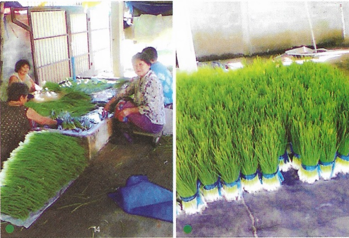 13. สมาชิกกำลังช่วยกันมัดต้นหอมแบ่งกันอย่างสนุกสนาน ใบเขียว