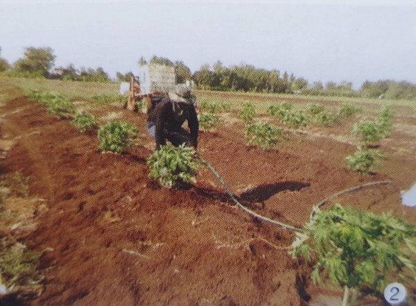 ผมไถพรวนตากดิน แล้วยกร่องสำหรับปลูกครับจากนั้นเตรียมหลุมสำหรับลงมะละกอ โดยมีความห่างระหว่างหลุมที่ 3 เมตร ส่วนความห่างระหว่างร่อง 2 เมตร สุดท้ายวางสายระบบน้ำหยดครับ