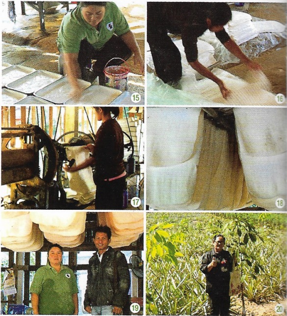 คุณกัญญา : ที่สวนใช้กิฟฟารีนมานานประมาณ 6 ปีแล้ว โดยทำสวนยางพารา 55 ไร่ มียางพาราอายุ 10 ปี จำนวน 15 ไร่ และยางพาราอายุ 20 ปี จำนวน 40 ไร่ สวนนี้ใช้ระบบกรีด คือ กรีดสามคืนเว้นหนึ่งคืนได้ ผลผลิตน้ำยาง 1,700 กิโลกรัมต่อ 6 มีด ในพื้นที่ 55 ไร่ หรือ ประมาณ 5 กิโลกรัมต่อไร่ต่อมีด