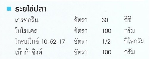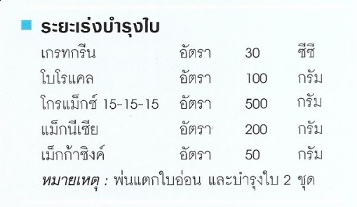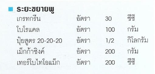 ผสมน้ำ 200 ลิตร ฉีดพ่นห่างกัน 7-10วัน  (ค่าปุ๋ย 368 บาทต่อน้ำ 200ลิตร)