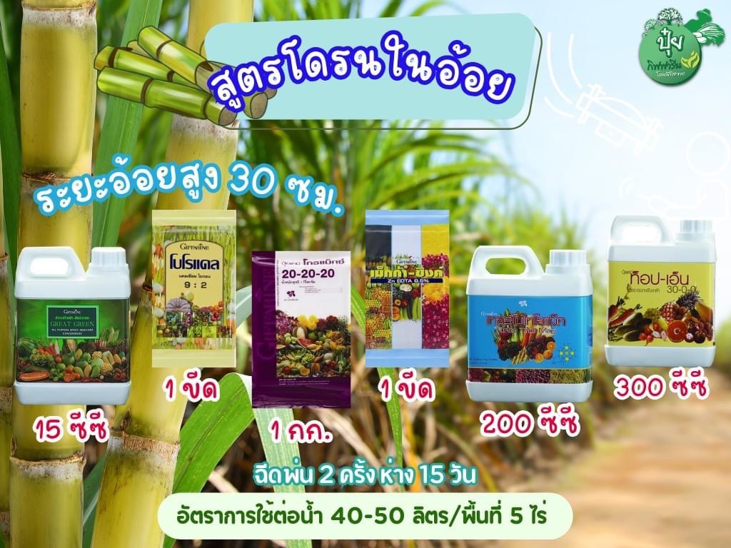 หมายเหตุ : พออ้อยเริ่มโตได้สักระยะ ก็ฉีดพ่นบำรุง ต้นและใบเหมือนสูตรอ้อยที่อธิบายมาข้างต้น