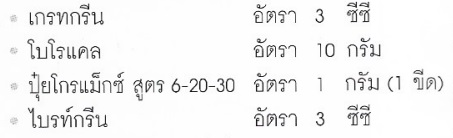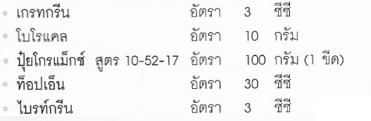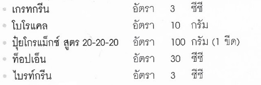 หมายเหตุ:ระยะเริ่มออกดอกตัวผู้ ฉีดพ่น 1 รอบ ถ้าดอกบานแล้วจะไม่ฉีดพ่น