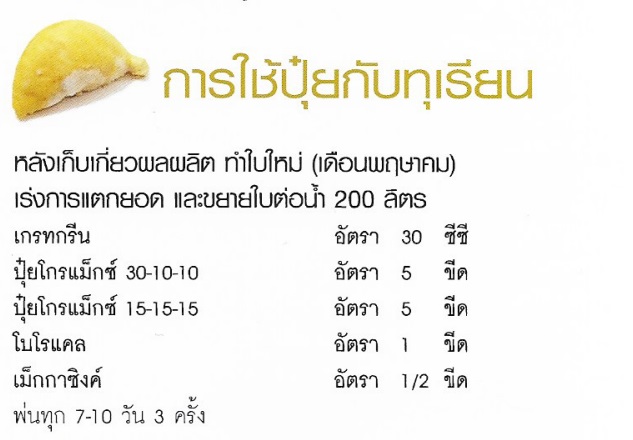 หมายเหตุ: ฉีดพ่น 3ครั้ง  พ่นที่ใบ (ถ้าทุเรียนไม่แตกใบอ่อน หรือ พ่นเฉพาะลูก ถ้ากลัวจะแตกใบอ่อน)