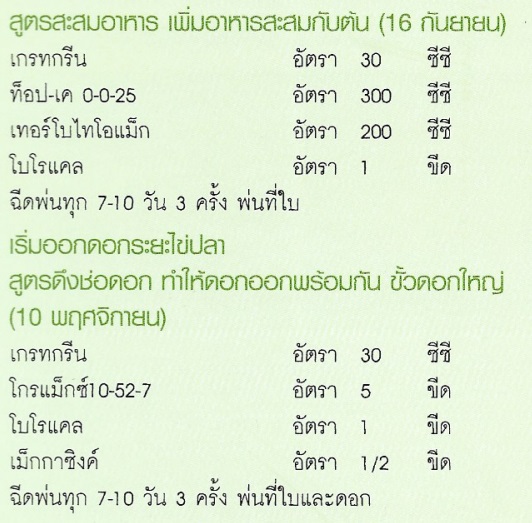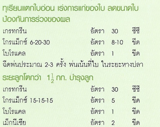 หมายเหตุ:ฉีดพ่นเฉพาะลูก เปลี่ยนสูตรปุ๋ยเมื่อลูกขนาด 0.5โล ฉีดพ่นประมาณ 4 ครั้ง พ่นเฉพาะลูก
